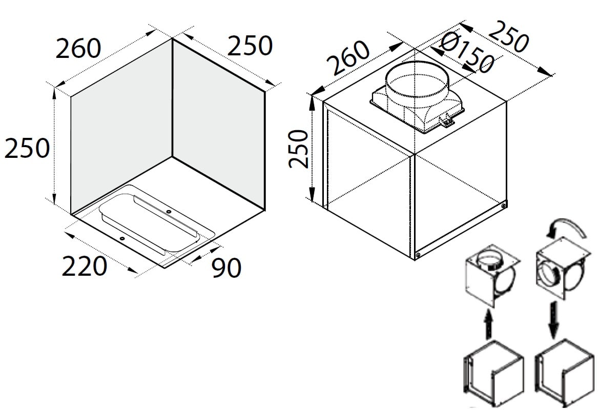 Tarkoitettu sisäasennukseen yläkaappiin. Mahdollisuus johtaa poistokanava taakse ja ylös. Mukana 1,5 m kaapeli