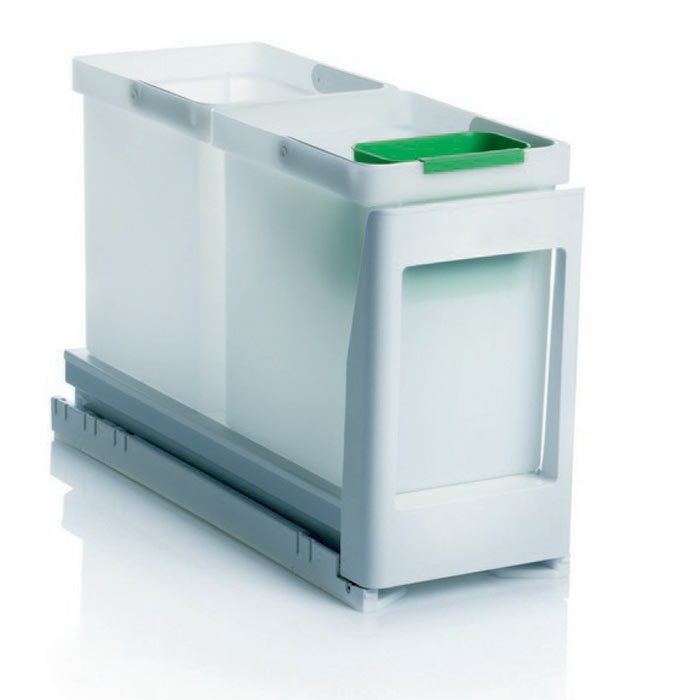Eico 2-1 on yksinkertainen ratkaisu pienempiin keittiöihin. Kaksi 10 litran astiaa tekevät lajittelusta helppoa, ja järjestelmä voidaan sijoittaa kaapin pohjalle ilman kantta.