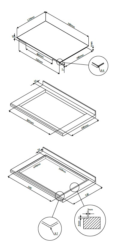 - Asennusaukko (LxSxK): 560 x 490 x 47 mm