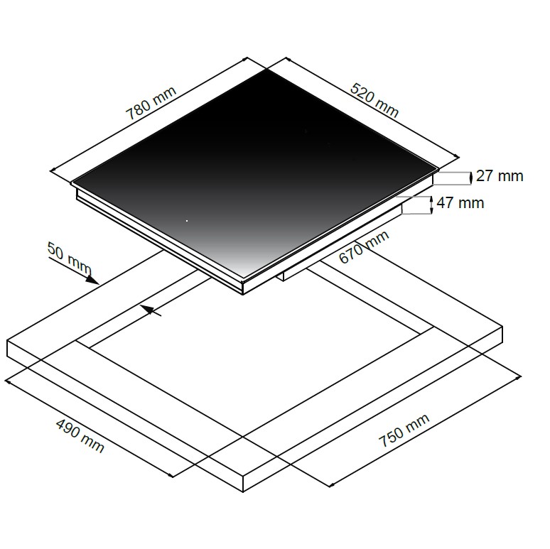 - Asennusaukko (LxSxK): 750 x 490 x 47 mm