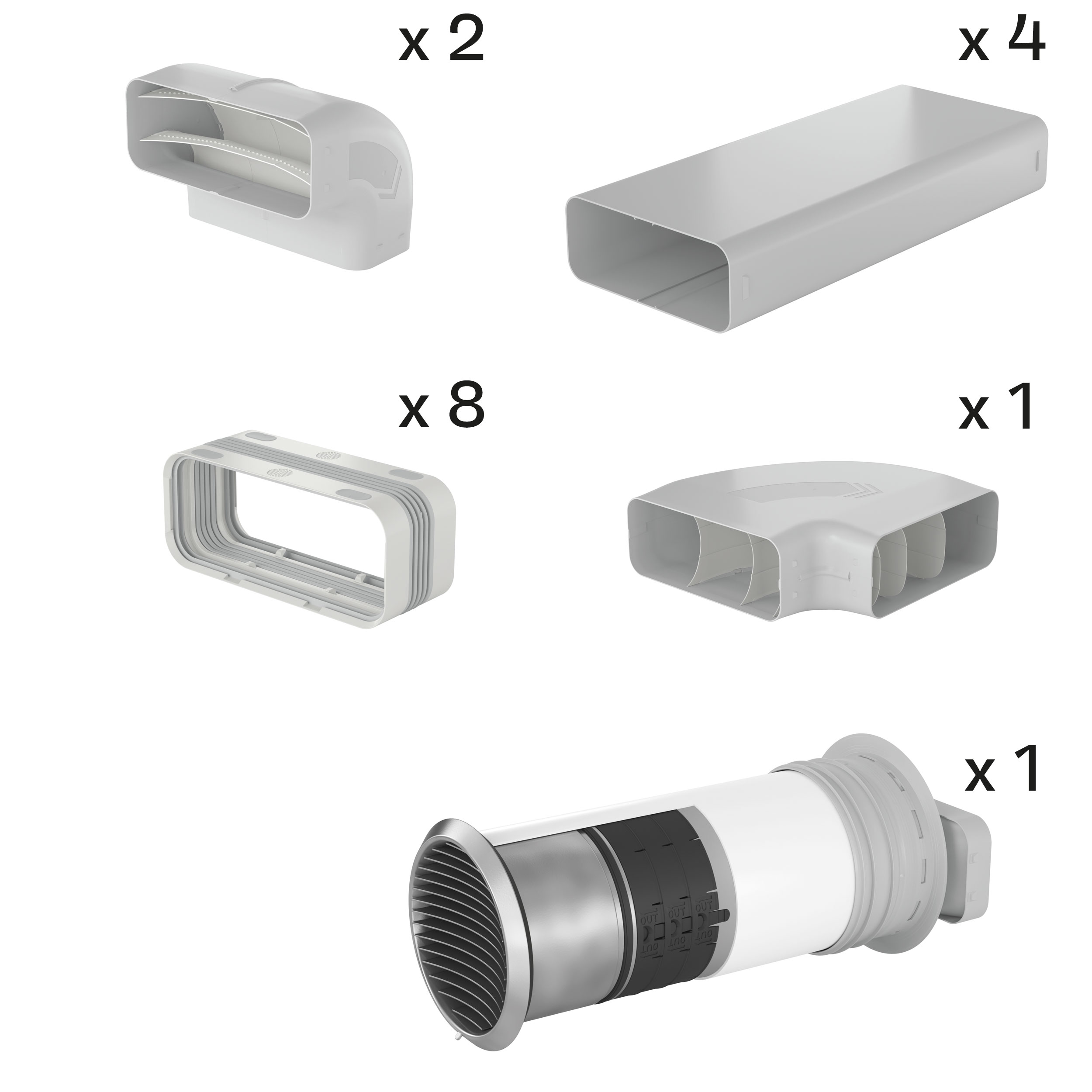 Prime-kanavapaketti 3 – Täydellinen ratkaisu lattian tasoon ja 3 metriä sivusuuntaan. Lisäputkia voidaan lisätä. Sarja sopii kaikkiin liesituulettimella varustettuihin keittotasoihin, joissa on 90x220 mm liitäntä.