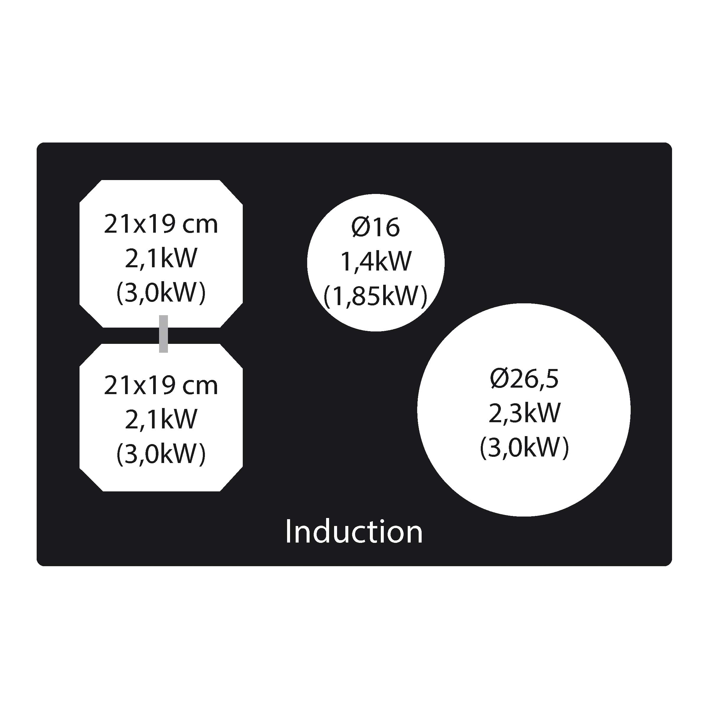 Vasemmalla puolella etu- ja takakeittoalue voidaan yhdistää yhdeksi suureksi keittoalueeksi (21x38 cm)