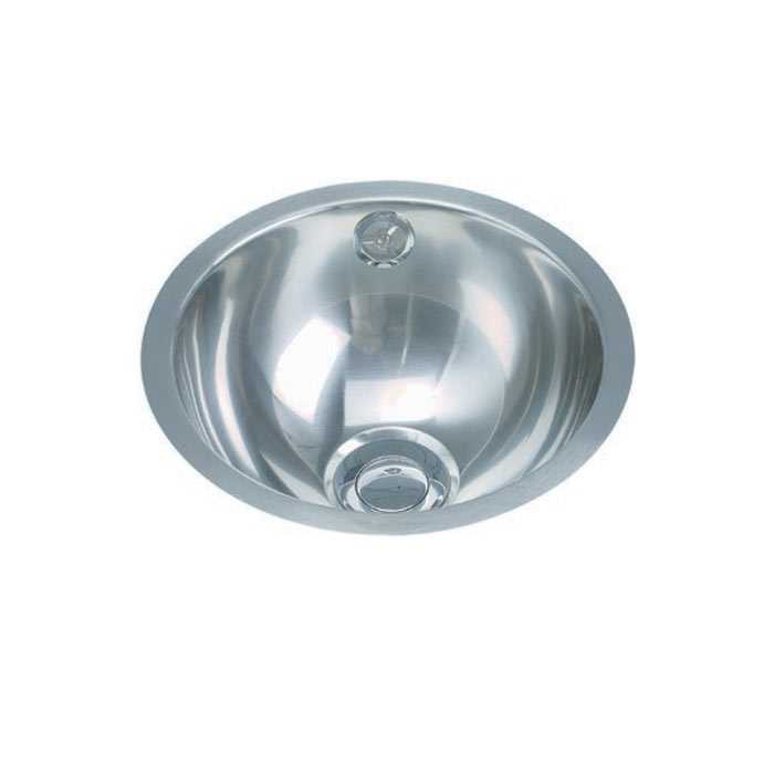 Pyöreä teräksinen pesuallas. Takareunalla. Altakiinnitettävä tai huullosasennus. - Korkeakiiltoinen ruostumaton teräs
