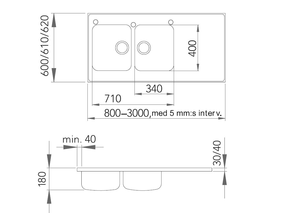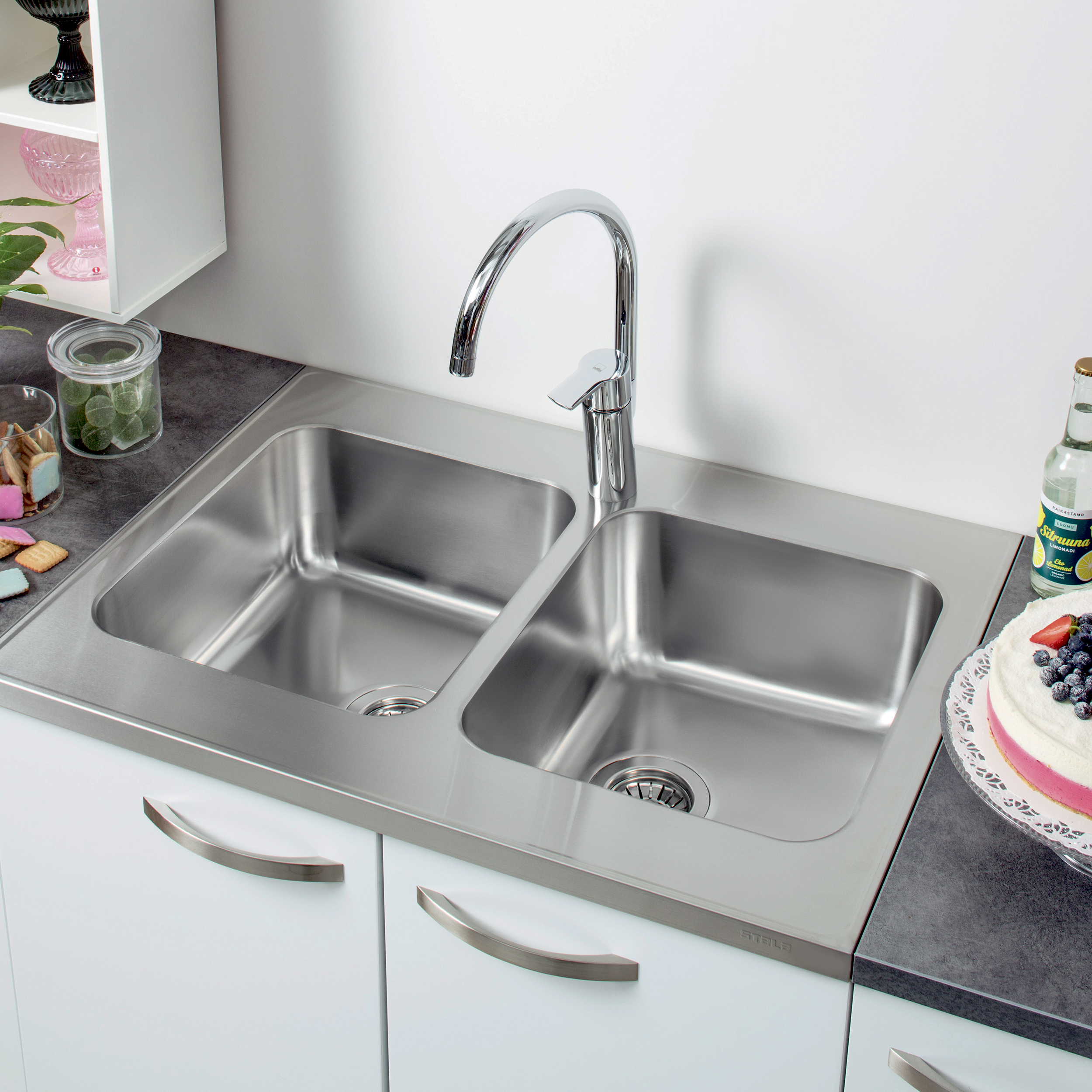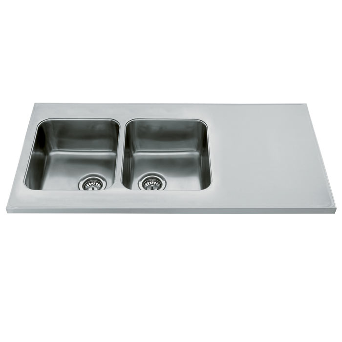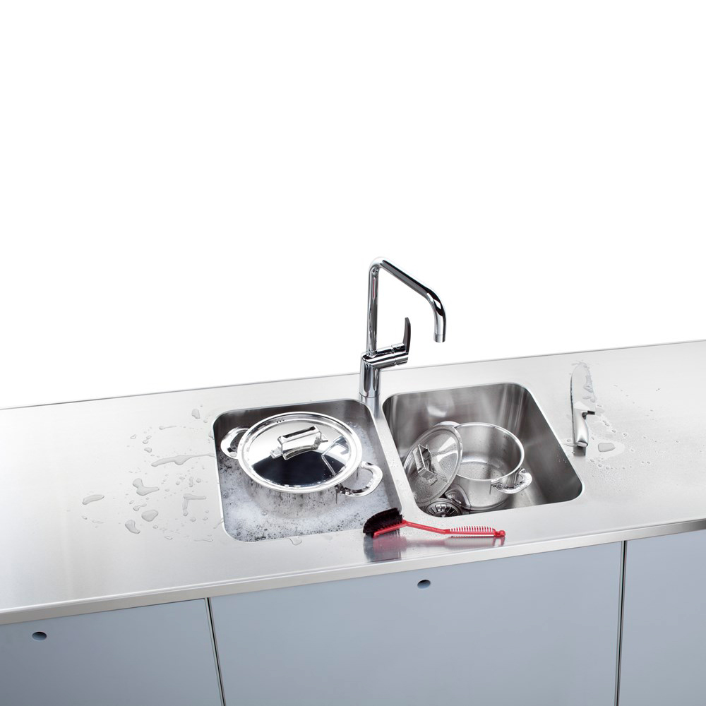 Seven A, Teräksinen pöytälevy tupla-pesualtaalla. Pöytälevyn pituus voidaan valita puolen senttimetrin välein. Tasainen tai nostettu reuna. Pinta on vakiona sileä. Sisustuskuvio voidaan tilata erikseen. Koripohjaventtiili voidaan tilata erikseen. Teräksinen takareuna voidaan toimittaa asennusta varten. Reuna on 58 mm korkea. Hanareikä voidaan tilata.