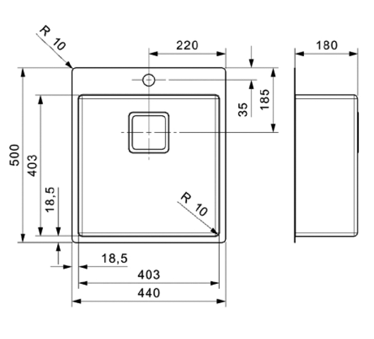 Teräsallas. Yksi allas takareunalla. Altakiinnitettävä tai huullosasennus. Sisäkulma R10. Reuna 20 mm. Toimitetaan hanareiällä