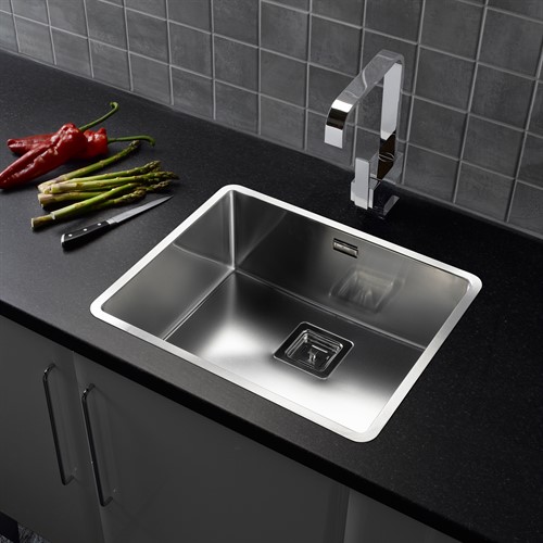Teräsallas. Yksi allas ilman takareunaa. Huullosasennus. - Ruostumaton teräs