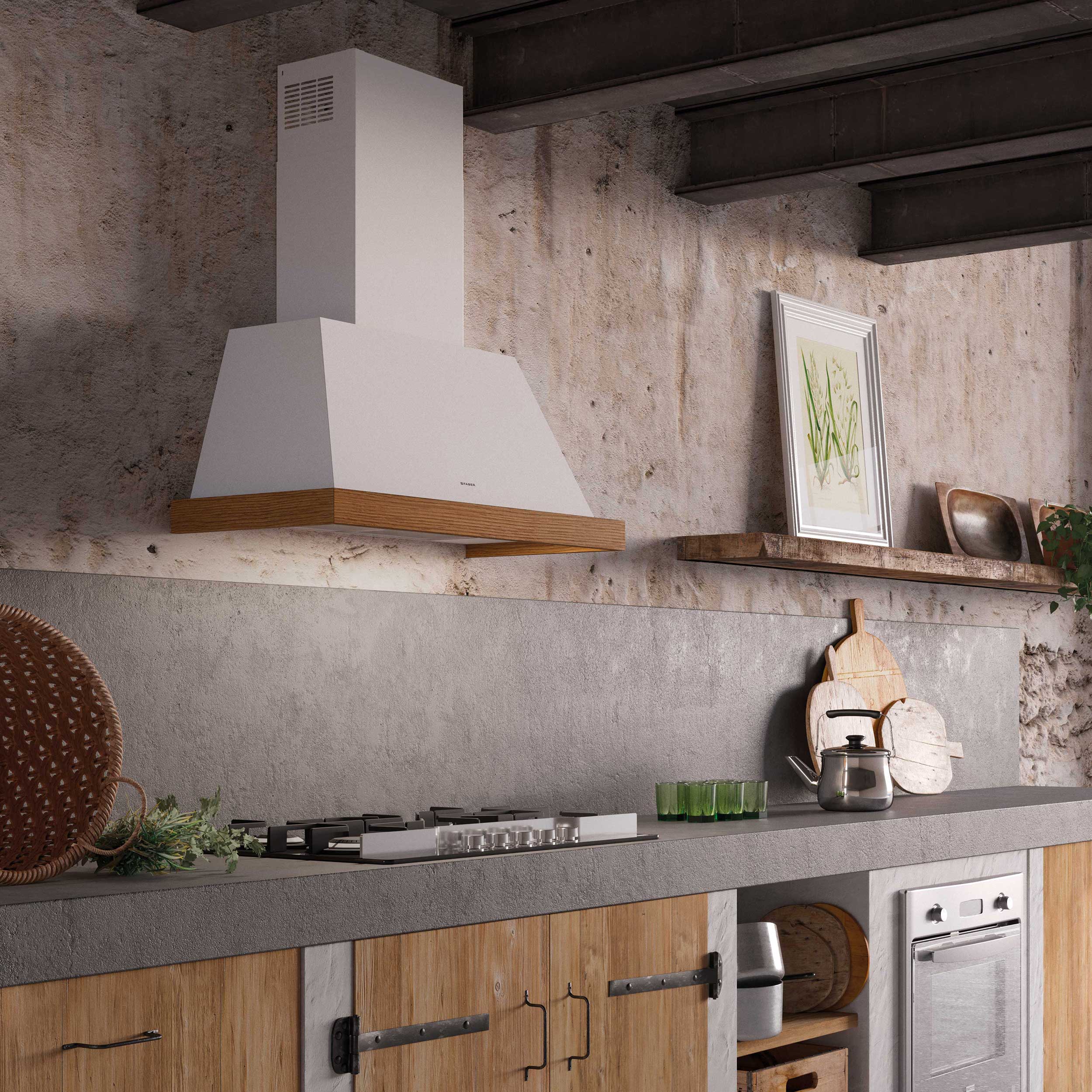 Thea 80 W Matt/Wood tuo valoa ja luonnonläheisyyttä keittiöön. Matta valkoinen ja massiivinen tammi muodostavat kevyen ja lämpimän ilmeen, joka sopii täydellisesti pohjoismaiseen kotiin. Sisäänrakennettu moottori varmistaa tehokkaan ilmanvaihdon, ja muotoilu tekee liesituulettimesta esteettisen keskipisteen.